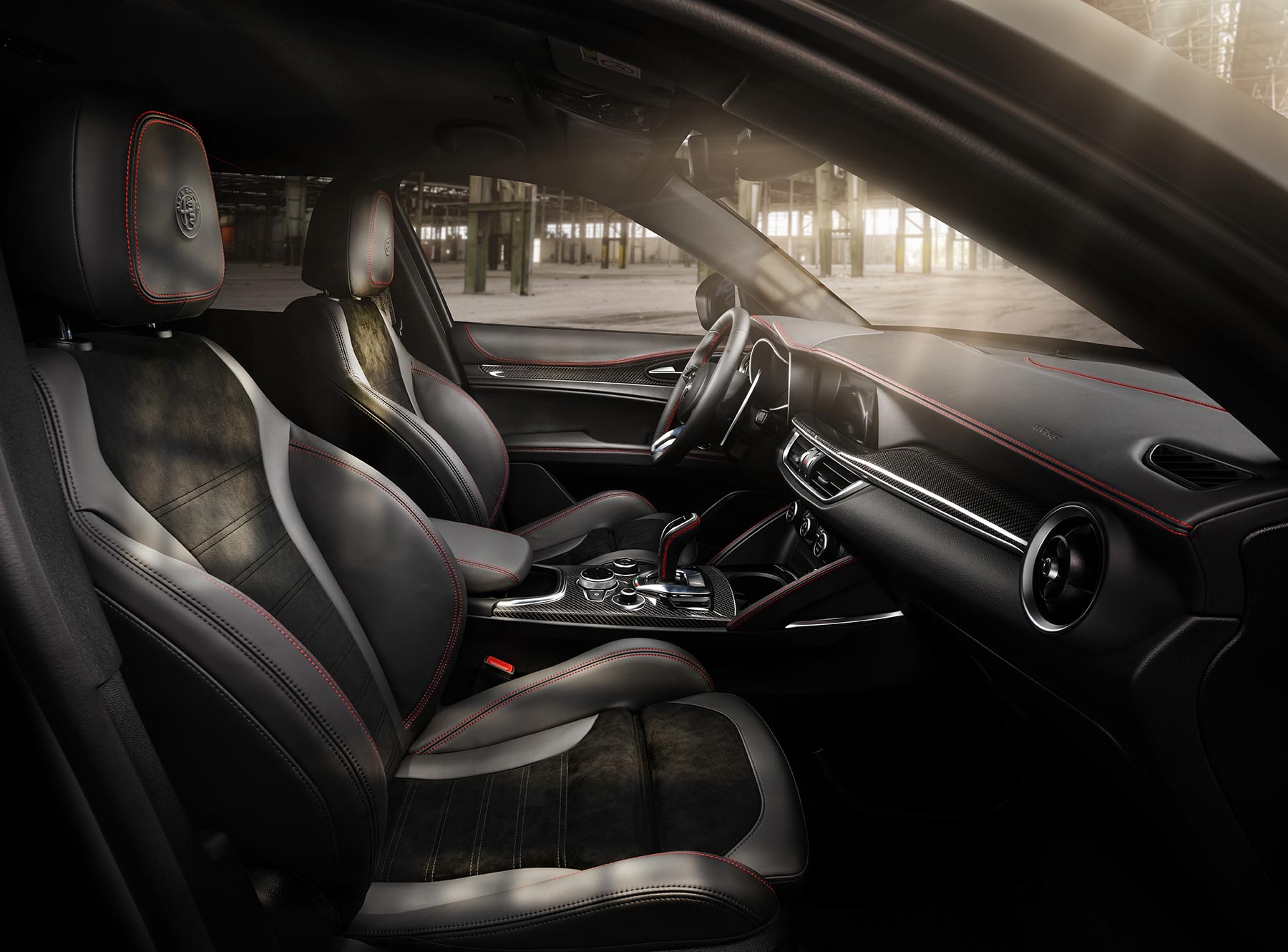 Im Interieur des neuen Alfa Romeo Stelvio Veloce Ti sind zahlreiche Details des Modells Quadrifoglio zu finden. Zu ihnen zählen beispielsweise die Sitze mit Bezügen in einer Kombination aus Leder und Alcantara, der schwarze Dachhimmel sowie Einlagen aus echter Kohlefaser.